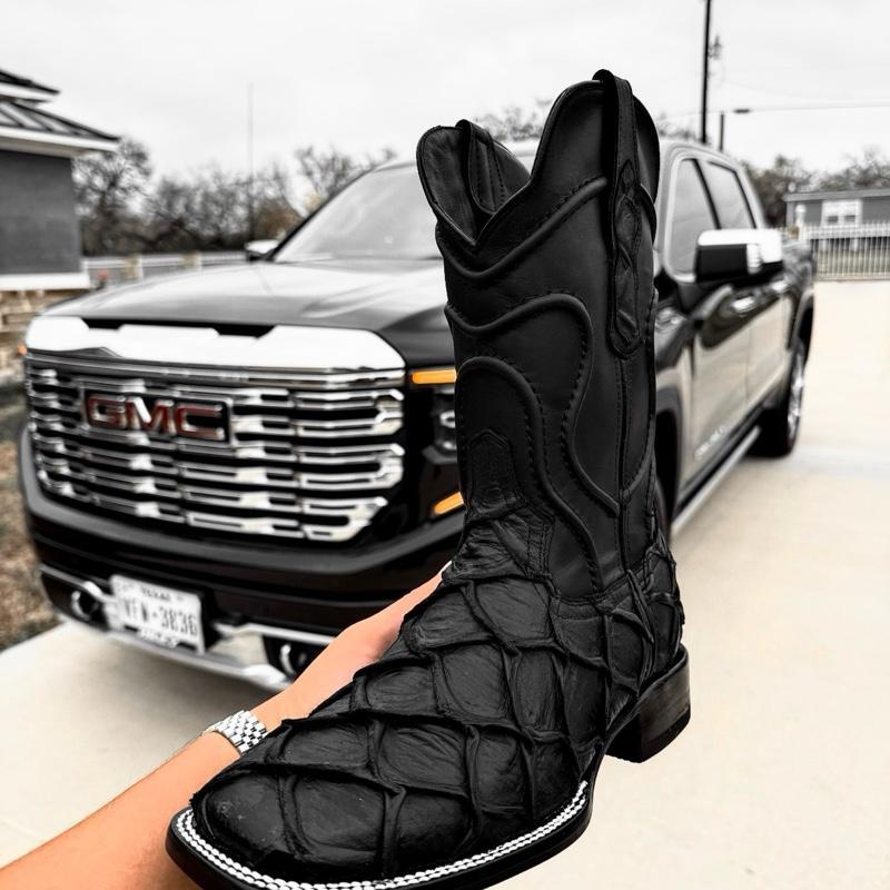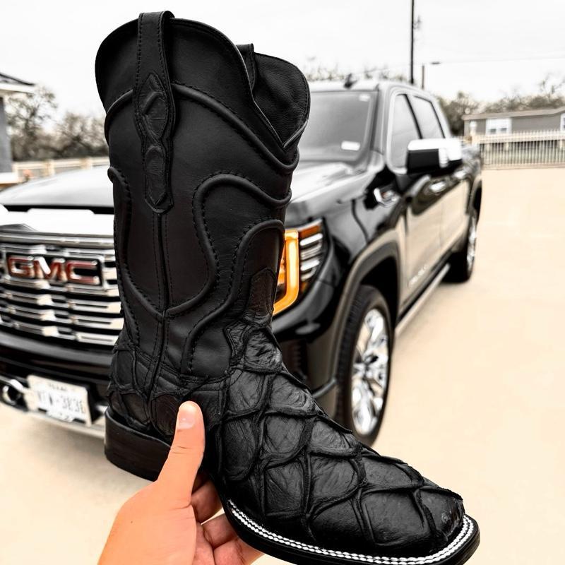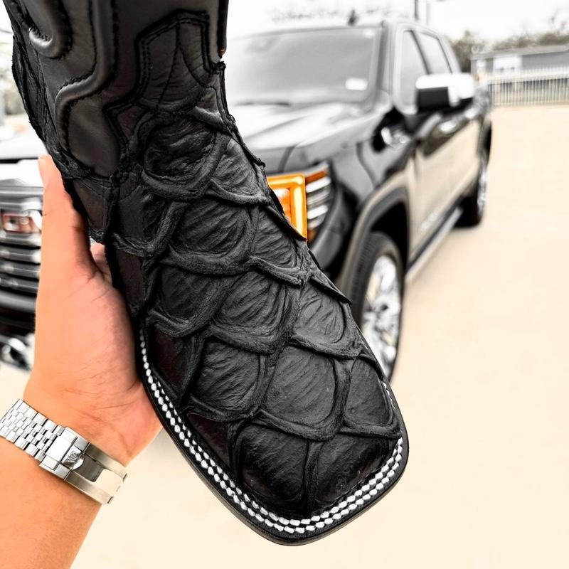 Classic Matte Black Pirarucu Leather Boots – Square Head